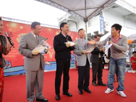 民國100年的一月份,是台北近40年來平均溫度最低的月份,只有13.8度,活動舉辦前還擔心天公不作美,無法聚集人潮。所幸第一天的活動,天氣舒適宜人,開幕典禮在鑼鼓舞獅團表演歡慶有餘的鼓聲中熱鬧揭幕。在新北市朱立倫市長親臨現場,以及新北市陳幸進議長、農委會曹紹徽處長、漁業署蔡日曜副署長、三重區楊義德區長、新北市五區漁會、中壢區漁會、永安區漁會、林園區漁會三巨頭等貴賓的蒞臨,讓開幕活動更顯熱鬧。朱市長除了祝福各位民眾在新的一年能夠事事順心,年年有餘之外,也在鮮魚一元競標的活動中與現場民眾互動,並以600元的價格順利標售出白鯧。漁會界大家長的省漁會黃一成理事長也上台致詞,在年關將近之際,歡迎各位貴賓於百忙之中,參與省漁會的活動,黃一成理事長並祝福台灣的漁業以及現場的所有來賓,在來年能夠幸福百分百,帆帆風順。整個開幕的活動,就在朱市長、陳議長、曹處長、蔡副署長以及本會邱正蓮常務監事與民眾競標台灣鯛、七星鱸等水產品的互動過程中熱鬧開場。